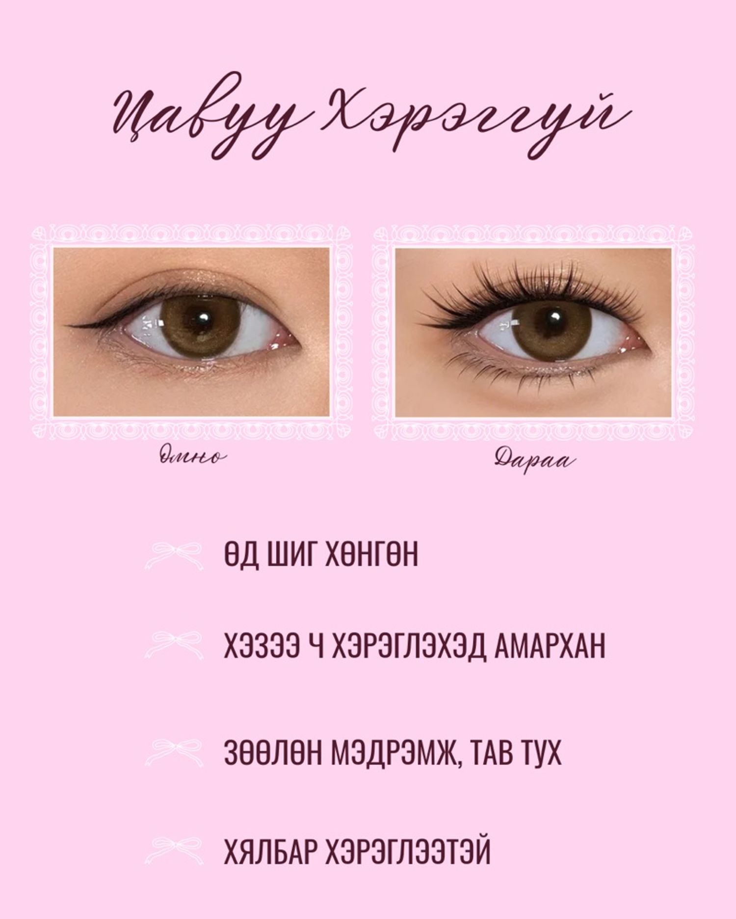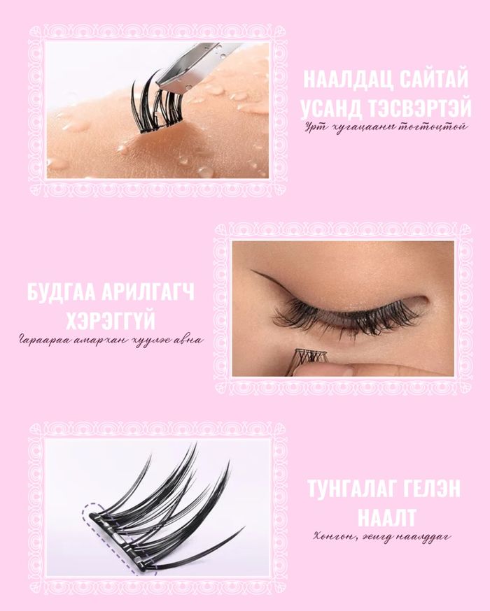 - Наах: Өөрийн сормуусны доороос өргөж зөөлөн дарахад л наалдана.